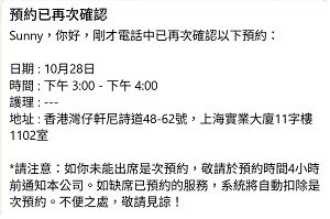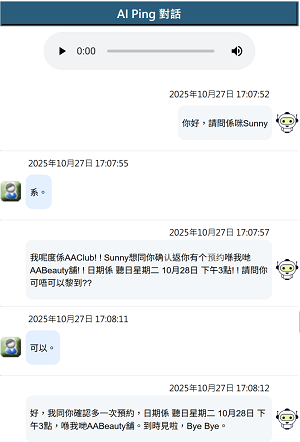 項目例子 (1) - 確認預約 「張小姐,聽日約咗你5點,你記唔記得呀?提下你,到時見。」 按此 :收聽 項目例子 (1) _ AI 語音 AI Ping 可以打電話俾客人,幫你確認預約,改時間或者取消預約,即時更新 b2b 系統。 項目例子 (2) - 生日祝福及通知 「陳小姐,知道你下個月生日,有份禮物想送俾你,下星期得唔得閒上嚟拿呀?」 按此 : 收聽 項目例子 (2) _ AI 語音 AI Ping 可以打電話俾生日的客人,幫你送出生日祝福,領取禮物的通知,即時更新 b2b 系統。 項目例子 (3) - 追 booking 「李小姐,好耐冇見你呀,之前買咗啲facial 都未用,要勤力啲保養㗎,下星期有冇時間上嚟呀?」 按此 : 收聽 項目例子 (3) _ AI 語音