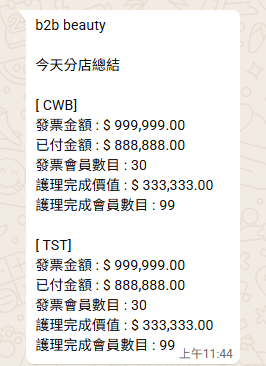 致 [各位客戶], 📱WhatsApp 報數📈 多謝你哋使用b2b,如果想WhatsApp 收到報數,任何時間,想知就知,可以使用我哋嘅WhatsApp報數服務 💰每個接收電話我哋只收每年$2000 📊要加數據請提出,我哋會另外報價 查詢及申請 請WhatsApp 2520 5128